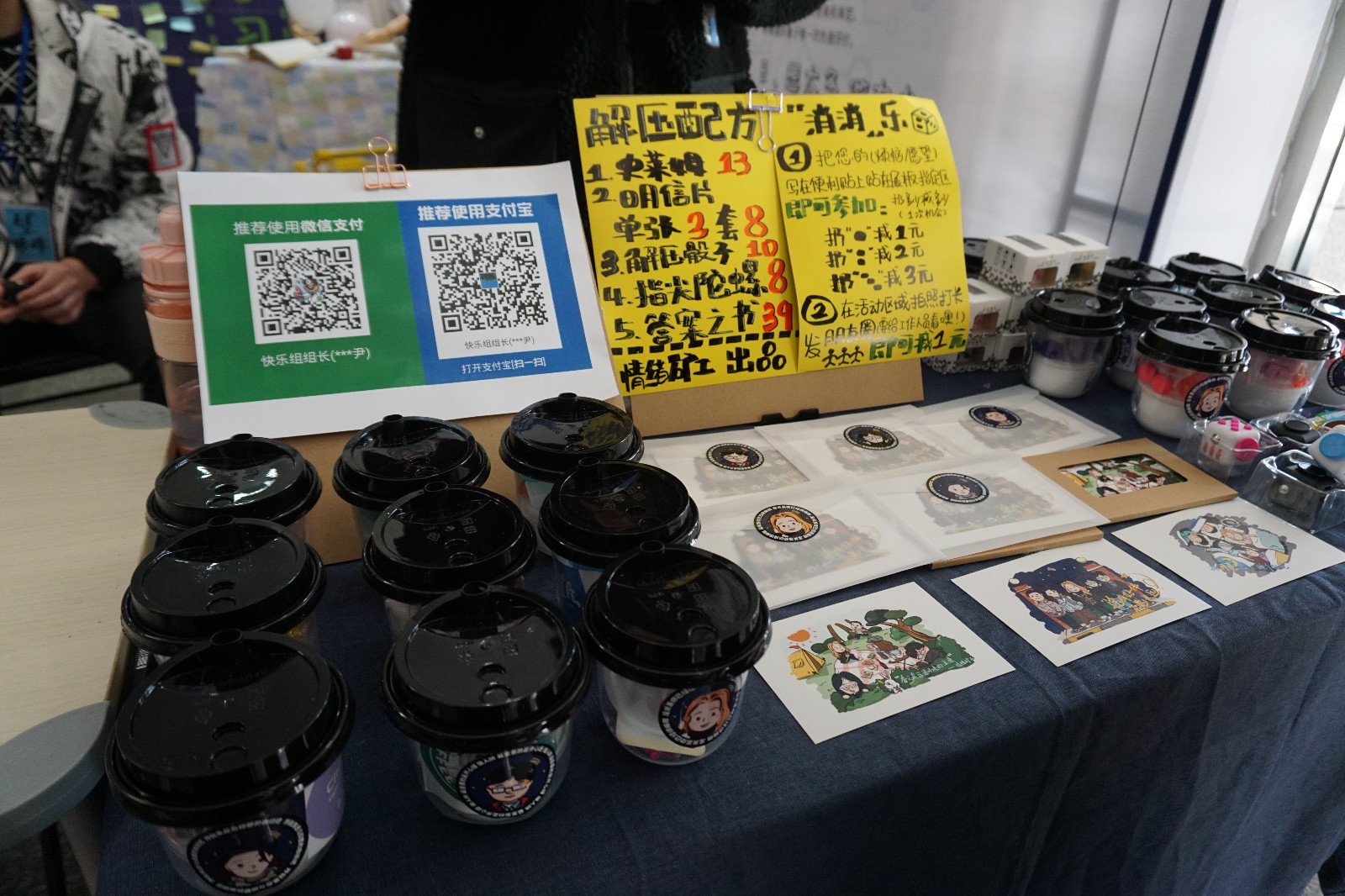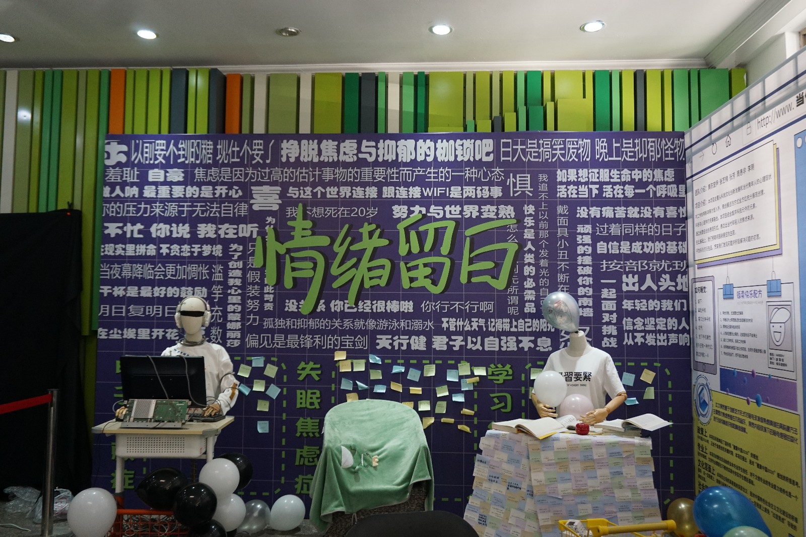 在展览中,同学们用强烈的色彩搭配对一面墙进行了布置,表现出了现在年轻人的焦虑来源。并用负面语言和正面语音的对比衬托,凸显解压主题。展览中还有同学们亲手写的解压便利贴,让整场展妙趣横生。在另一面墙上,同学们展示了当代青少年情绪压力现状和结构,梳理出焦虑产生的八个原因,从而让同学们更好地认识和理解焦虑,从而对症下药缓解焦虑,达到解压的目的。