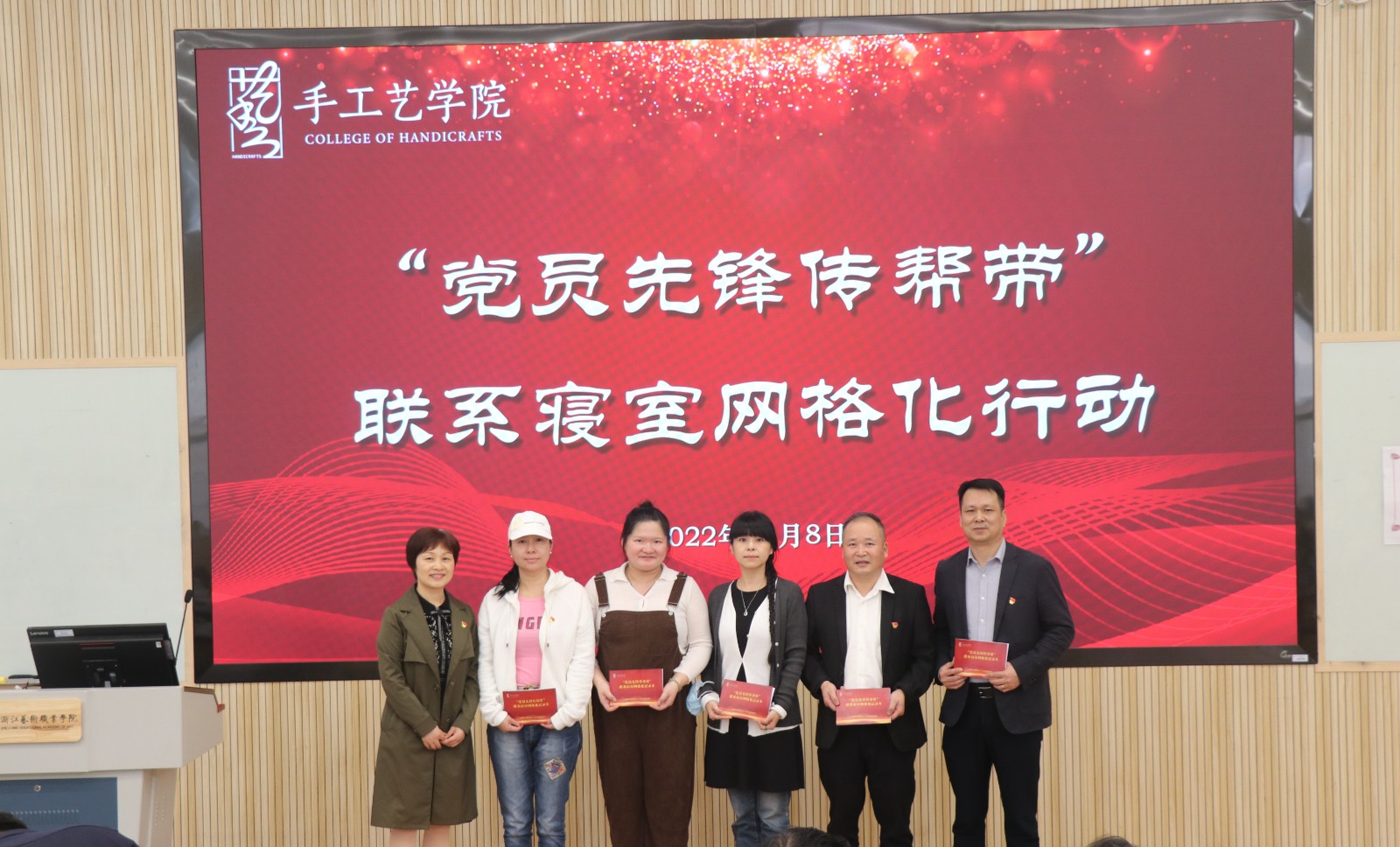 王筱芽重申了党员联系寝室名单。手工艺学院党总支、资产管理处党支部、产学合作处党支部结对支部党员分别上台作自我介绍,并颁发《手工艺学院“党员先锋传帮带”联系寝室网格化记录本》。