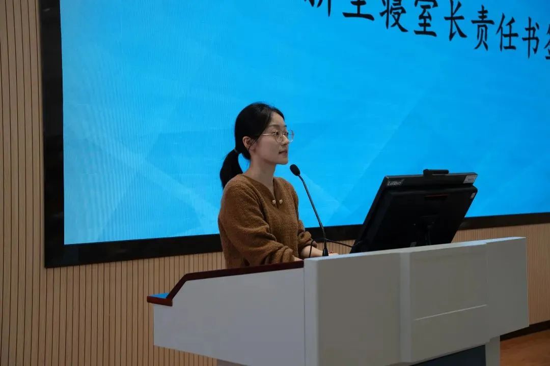 李雨波重点强调了公寓考勤和寝室安全、卫生工作的重要性,她向寝室长们详细讲解了《网格员记录本》的使用方法及填写要求,并带领22级全体寝室长签署《寝室长工作责任书》。