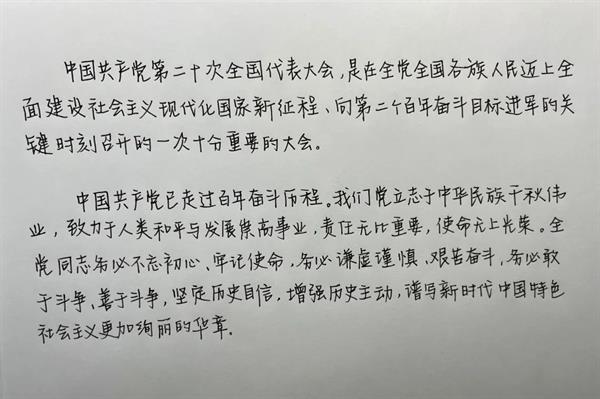 经过初赛的选拔,共有6位选手晋级复赛。选手们通过朗读党的二十大报告原文、手写文稿、提供相应的音频等形式,结合自身对党的二十大报告的体会,交流思想、分享感悟,朗读比赛现场气氛热烈,感染了现场的每一位观众,充分展现了演教学子紧跟时事、爱党爱国的良好风貌。在场的选手们不仅用朗读的方式表达了对党的二十大胜利召开的激动,更是用文字抒发了自己对党和祖国的尊敬与热爱。