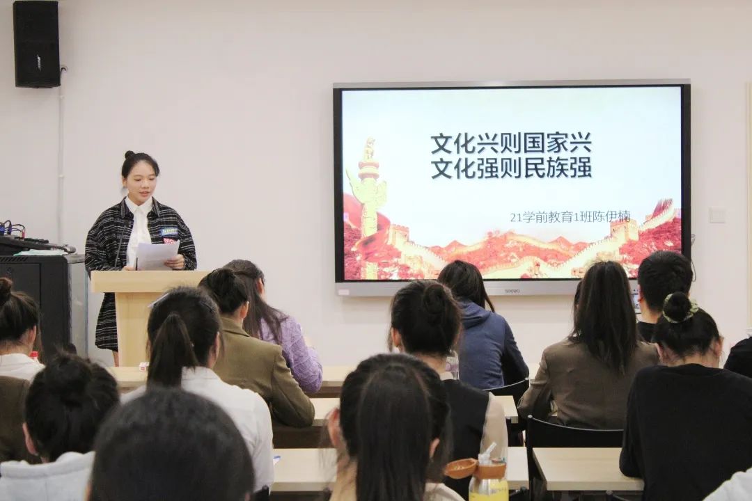21学前3班学生陈文清,通过讲述国家“四”个自信中的文化自信,强调教育对幼儿的影响,应将传统文化播种在幼儿心中,生根发芽。