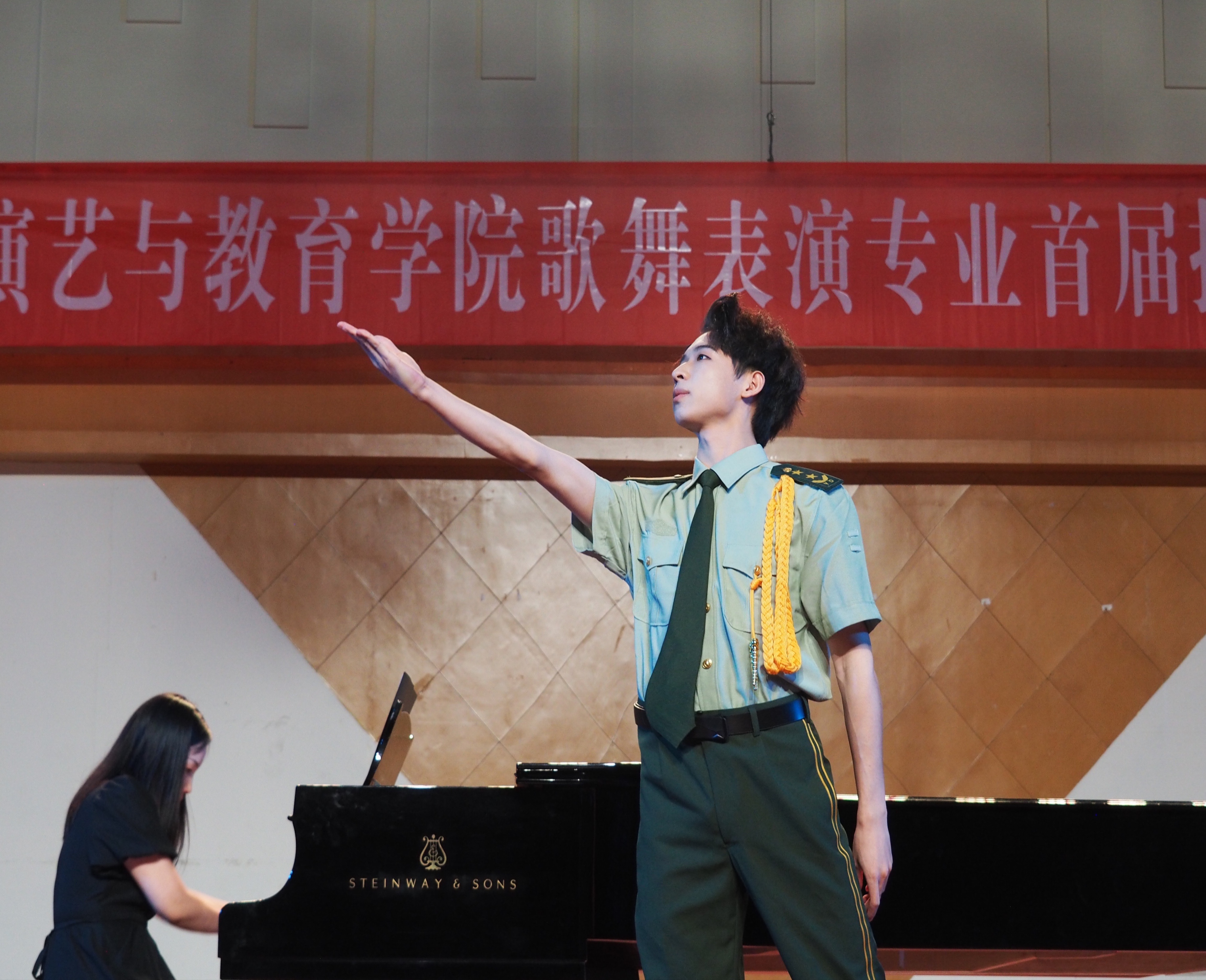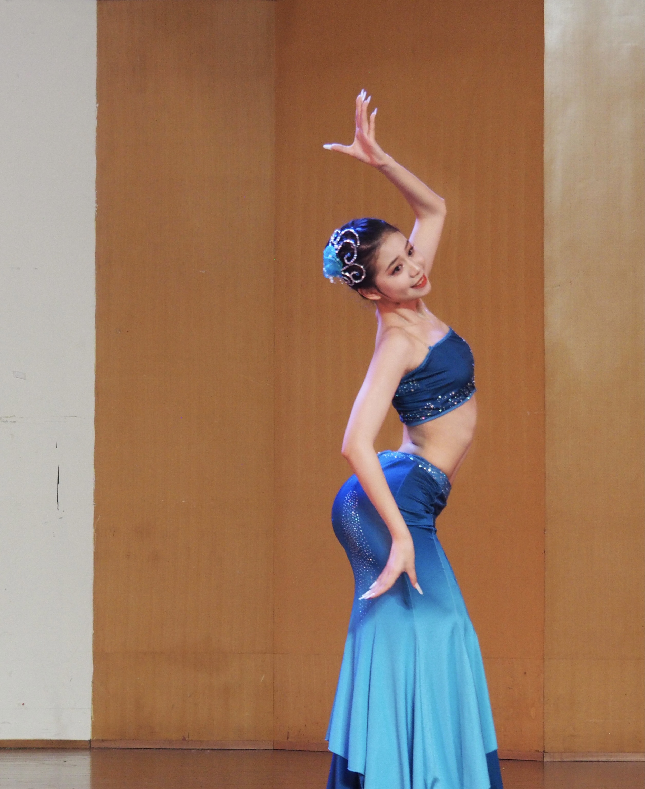 20歌舞班黄伊辰演唱新疆歌曲《打起手鼓唱起歌》,穿着一身新疆民族的服饰,拿着手鼓上场,把观众带入鲜花怒放碧草无垠的美丽新疆;展示傣族舞《花儿》展示傣族女儿该有的灵动和令人陶醉的柔美。