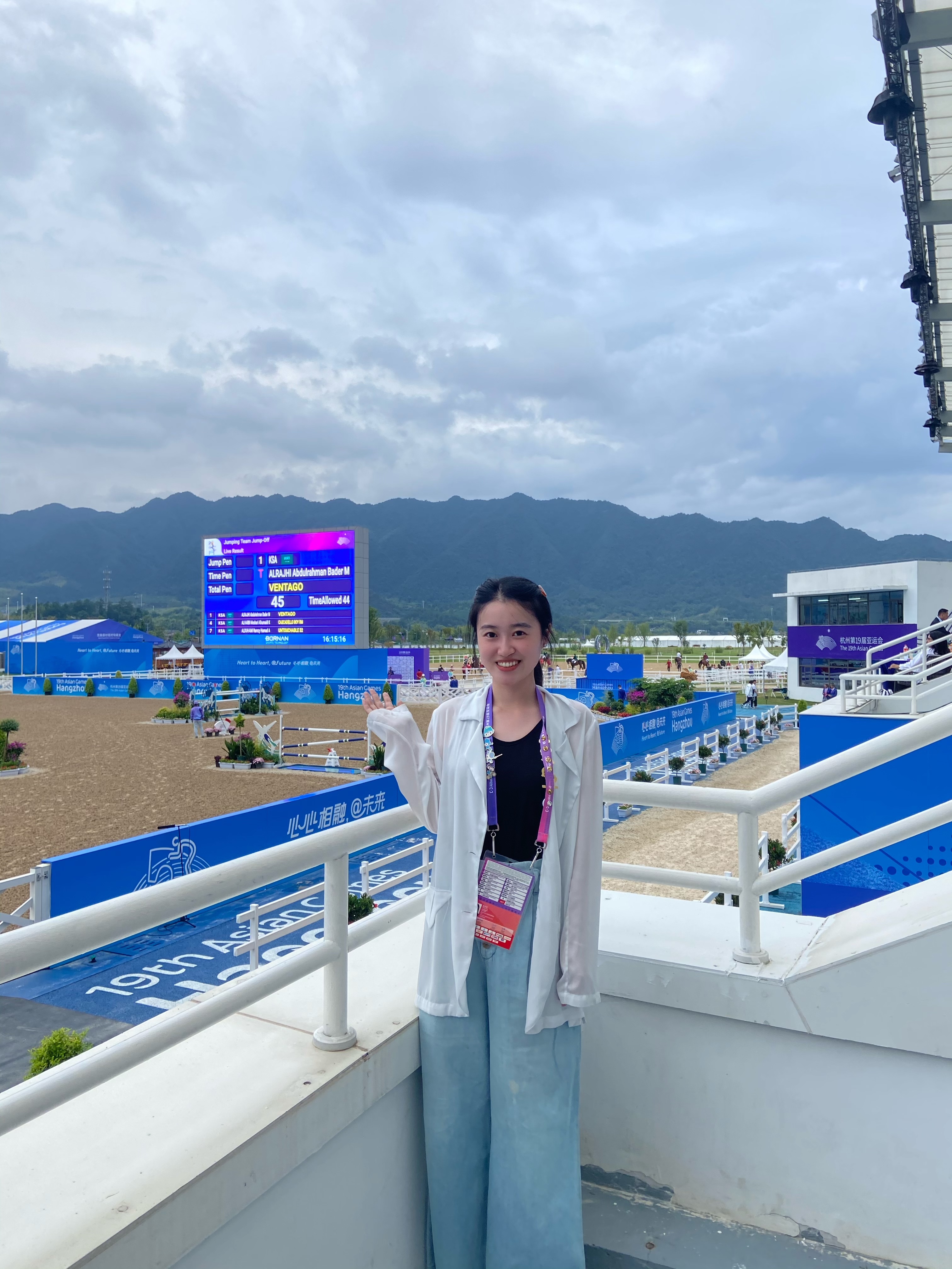 在亚运期间,我服务的贵宾是来自亚奥理事会副主席Takeda Tsunekazu先生,在交谈相处后,发现Takeda先生是一位非常具有体育精神的人,他的每一场观赛都非常专注。他曾经是一位马术运动员,在马术赛事期间我陪同Takeda先生每天前往桐庐马术中心,我也第一次关注到马术这项运动。这是所有的赛事中唯一一项运动员与动物同场竞技的运动,赛程中不乏出现骑手与马匹配合不当以至于被甩下马的情况,深刻体会到每一项运动的精彩与不易。在亚运赛事期间,Takeda先生多次为竞赛获胜者颁奖,我也有幸全程见证了幕后工作人员有效的引导,深感荣幸自己也能成为亚运工作者之一,每一个场馆、每一个领域的工作人员、志愿者都展现了杭州人民独特的魅力风采。此次亚运之行,对我来说,感触颇深,感谢浙艺提供了一次亚运限量版体验,希望可以将亚运精神带回浙艺继续传递下去。