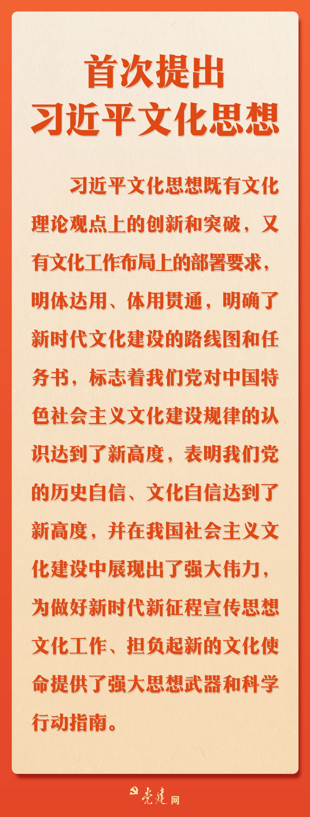 会议强调,习近平文化思想内涵十分丰富、论述极为深刻,既有文化理论观点上的创新和突破,又有文化工作布局上的部署要求,明体达用、体用贯通,明确了新时代文化建设的路线图和任务书,是新时代党领导文化建设实践经验的理论总结,丰富和发展了马克思主义文化理论,标志着我们党对中国特色社会主义文化建设规律的认识达到了新高度,表明我们党的历史自信、文化自信达到了新高度,并在我国社会主义文化建设中展现出了强大伟力,为做好新时代新征程宣传思想文化工作、担负起新的文化使命提供了强大思想武器和科学行动指南。