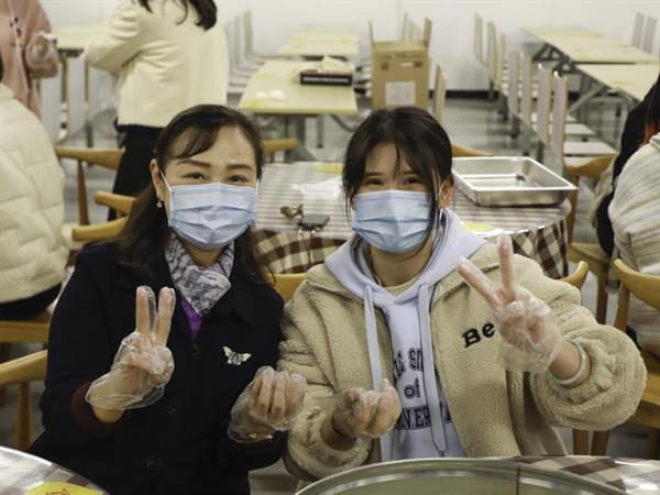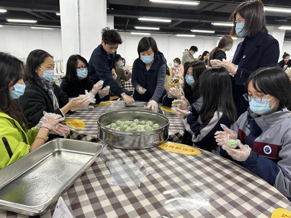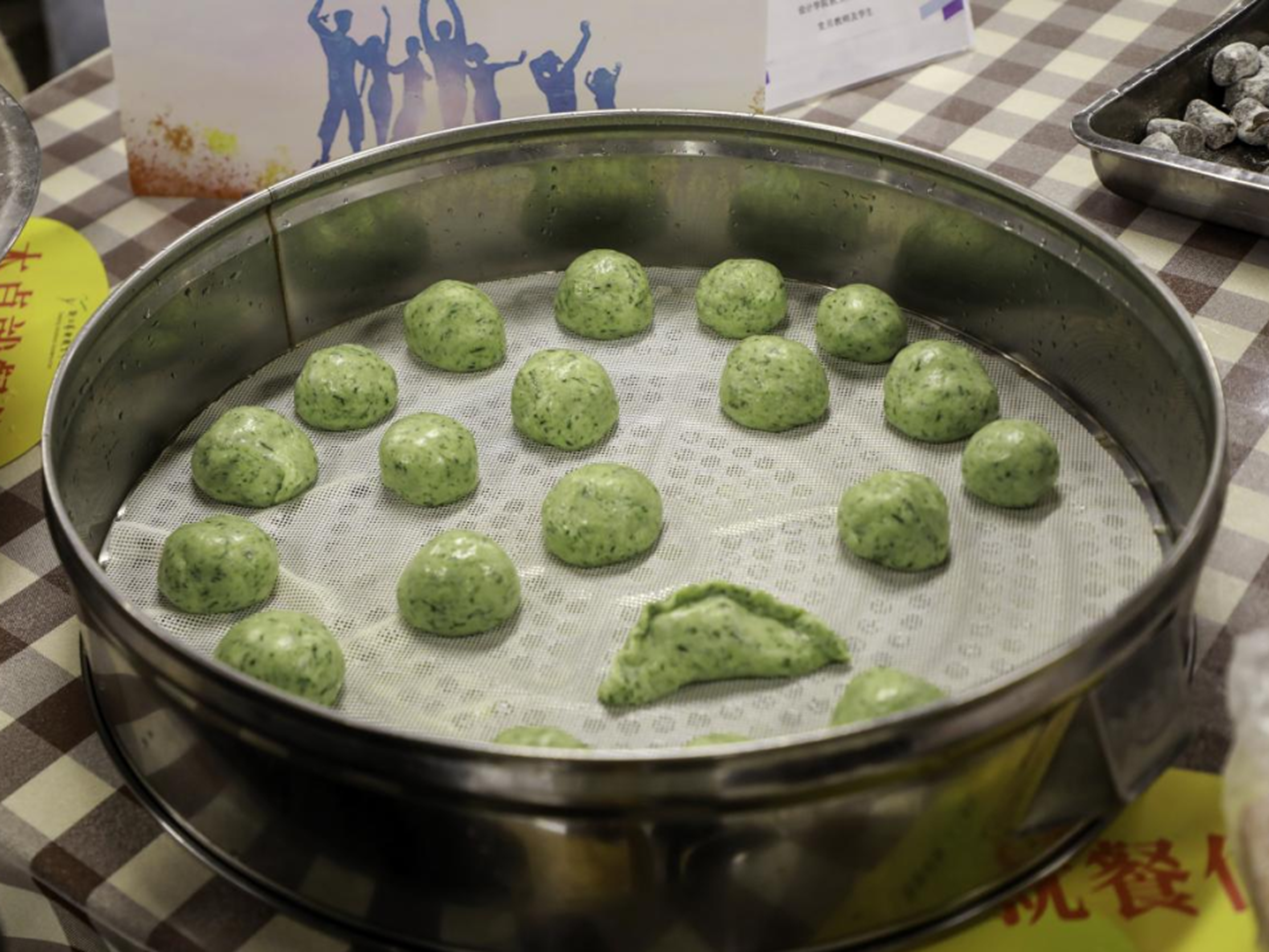 活动现场,热闹非凡。食堂师傅为大家详细讲解做青团的步骤,包括面团的揉搓方法、青团的包制手法和蒸制方式等。师生们相互配合、团结协作、忙活开来:倒糯米粉、拌艾草汁、揉搓成团、擀皮包馅……互相诉说着自己家乡清明节的习俗。
