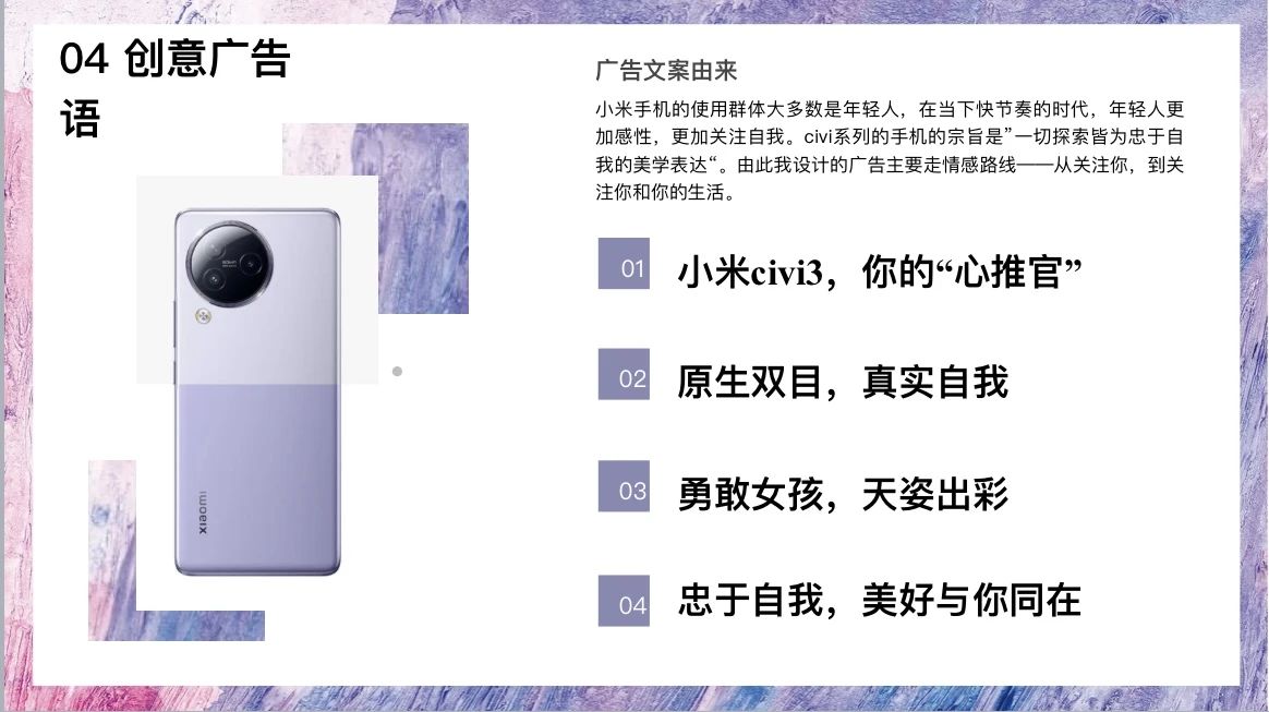 创意文案考核内容:为某款产品策划一套视频广告创意方案,目的是考察学生对广告脚本策划的创新能力和文字的把控能力。评分标准围绕着创意、文字、方案架构、逻辑表达、设计审美、主题内容、平面广告设计(额外加分项),共七个方面。