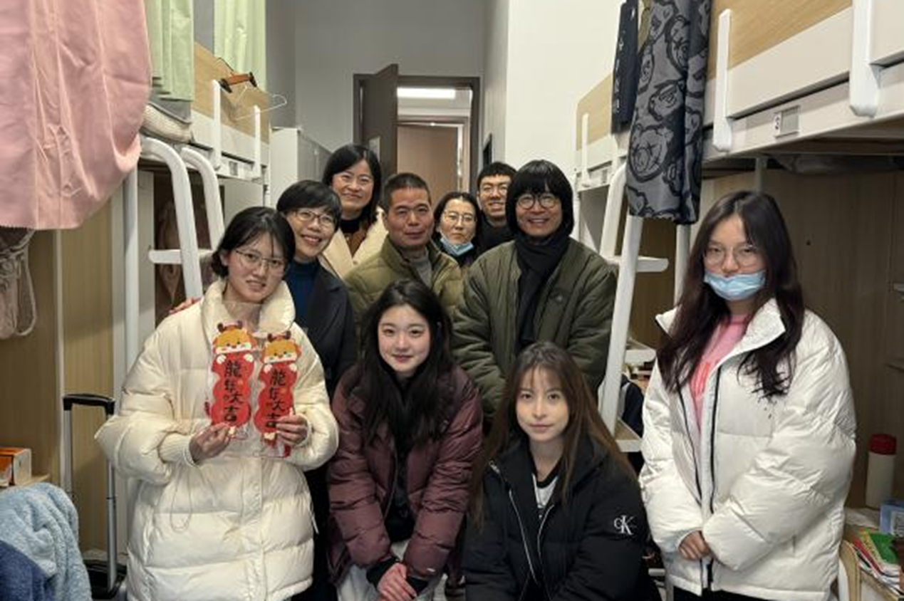 设计学院领导班子、全体班主任和辅导员走访学生寝室,细心查看宿舍环境,关注每一位学生的返校情况,询问学生的学习生活需求,为学生送上关怀,叮嘱学生认真完成劳动教育,保持整洁干净的寝室卫生环境。老师们还精心准备了富含龙年元素的春联、挂件,写满了对学生的美好寄语,让浓浓的年味与深深的人文关怀交织在一起。