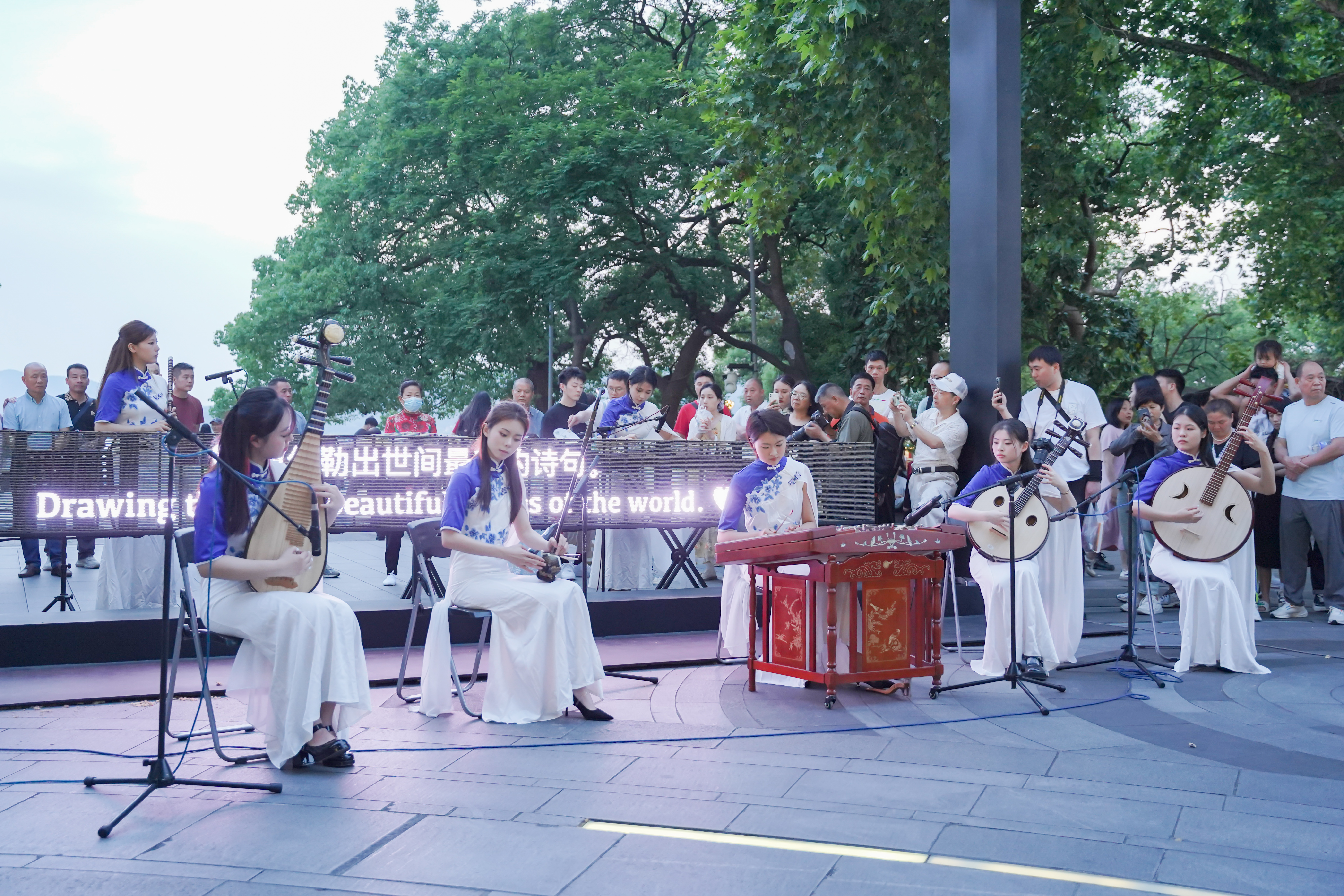 这场音乐会被誉为“盲盒音乐会”,通过整合艺术院校、专业院团的资源,来丰富和活跃群众文化生活,让艺术走进群众,进一步提升公共文化服务的质量和水平。结合“文艺赋美”工程,音乐学院“江南女乐”乐团在如诗如画的西湖边用中国传统乐器演奏动人的乐曲,观众们早早的围坐成圈等待演出,这次的专场演出,乐团准备的曲目大部分以江南风格、浙江音乐为主,如《忆江南》《苏堤漫步》《采茶舞曲》等。在音乐响起的那一刻,大家都安静下来仔细聆听,也吸引了众多行人驻足欣赏。观众们感叹:“江南风光与民乐的交织简直太浪漫!这种艺术形式能更直观的传递情感,让路过的游人都能产生幸福感,将优美艺术呈献给观众的同时也传达了积极向上的价值观。”