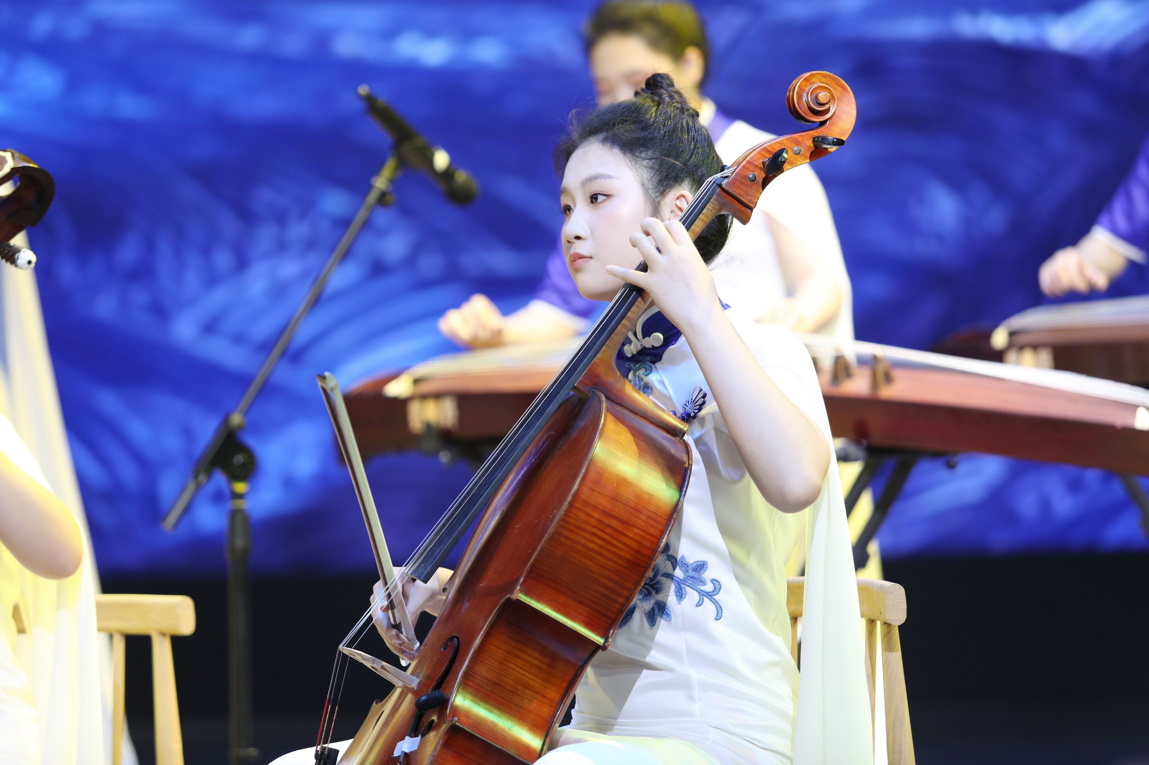 作为全国文化馆服务宣传周活动主会场的一大亮点,浙艺音乐学院“江南女乐”乐团的专场“文艺赋美”演出在西湖边精彩上演。乐团的女孩们穿着蓝白相间的礼服,身侧随风飘动的纱带如同西湖的涟漪,随着优美的音乐进入观众视野,为大家奉献了一场绝美浪漫的视听盛宴。